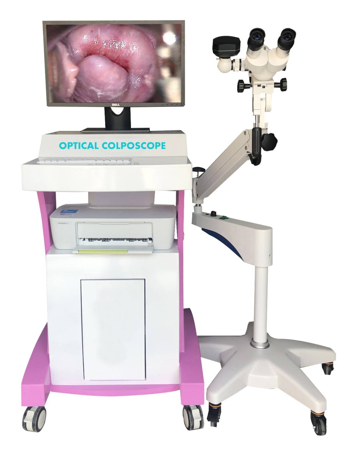Windows7操作系统、显微光学镜头、全金属镜头支架(医用底座、直臂、平衡臂,上下调节臂)、医用光学镜头云台、医用冷光源光纤、高性能,高配置品牌阴道镜主机、彩色打印机、19液晶显示器、医用推车、自主开发的最新阴道镜图像处理软件、逐行扫描图像处理卡、医用脚踏开关、医用专业视频信号线等组成。